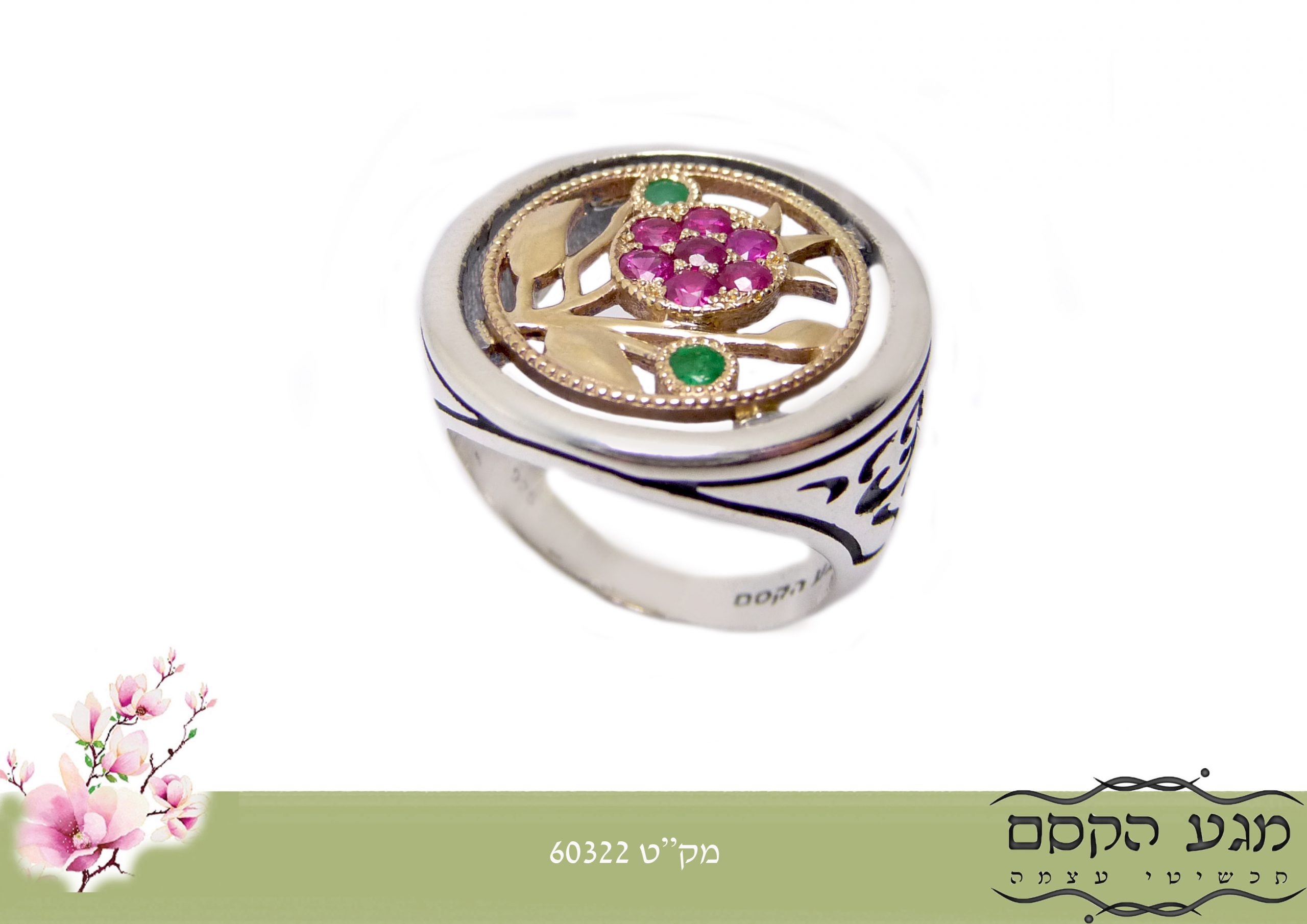 טבעת כסף בשילוב רימון מזהב משובץ באבני החושן